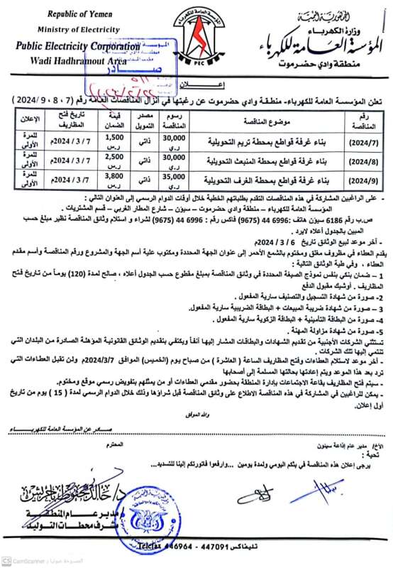 *تعلن المؤسسة العامة للكهرباء منطقة وادي حضرموت عن إنزال المناقصات التاليه:*
