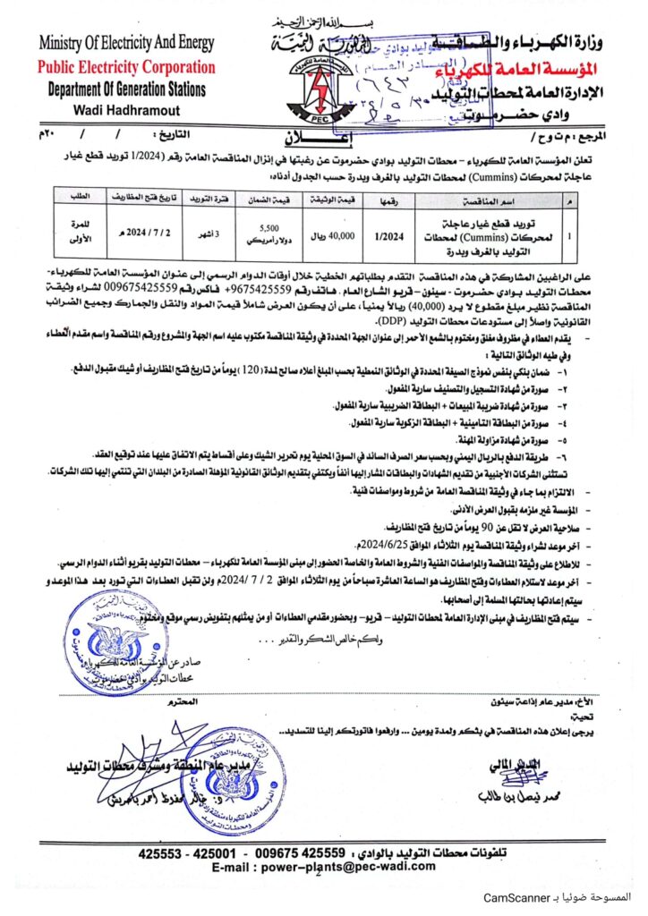 *تعلن المؤسسة العامة للكهرباء- الإدارة العامه لمحطات التوليد بوادي حضرموت عن إنزال المناقصة التالية:*