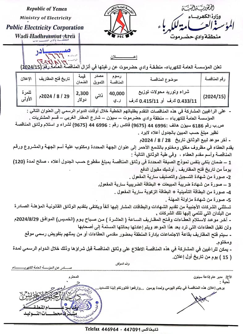 تعلن المؤسسة العامة للكهرباء منطقة وادي حضرموت عن إنزال المناقصة التاليه: