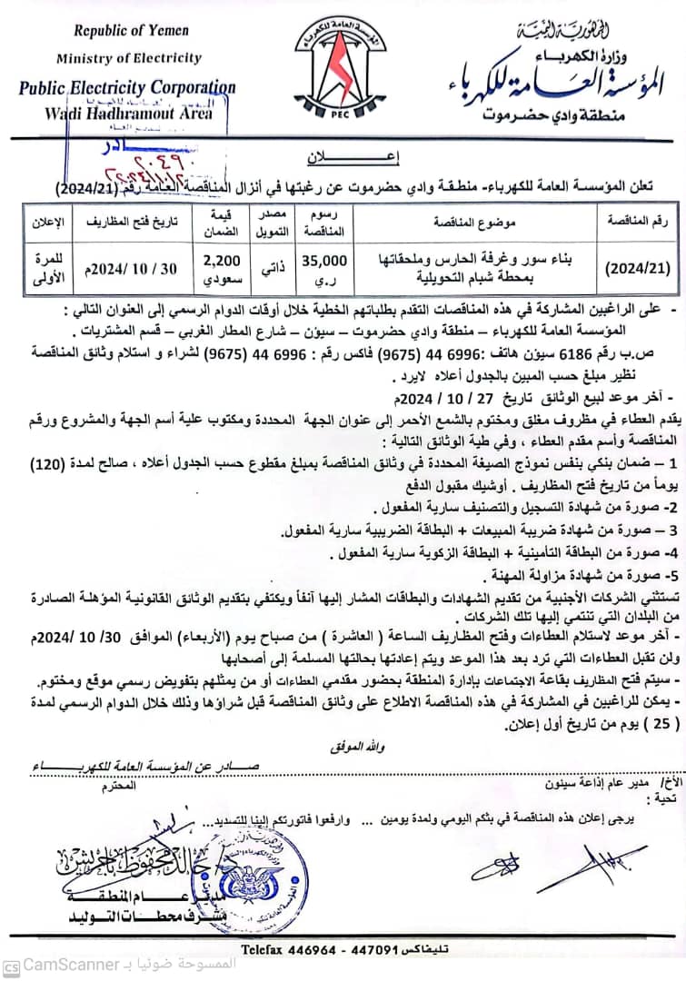 تعلن المؤسسة العامة للكهرباء منطقة وادي حضرموت عن إنزال المناقصة التاليه: