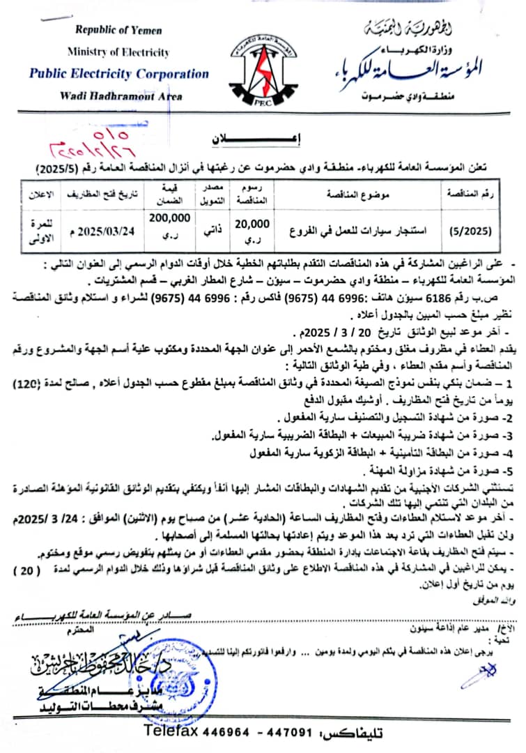 تعلن المؤسسة العامة للكهرباء منطقة وادي حضرموت عن إنزال المناقصة التاليه: