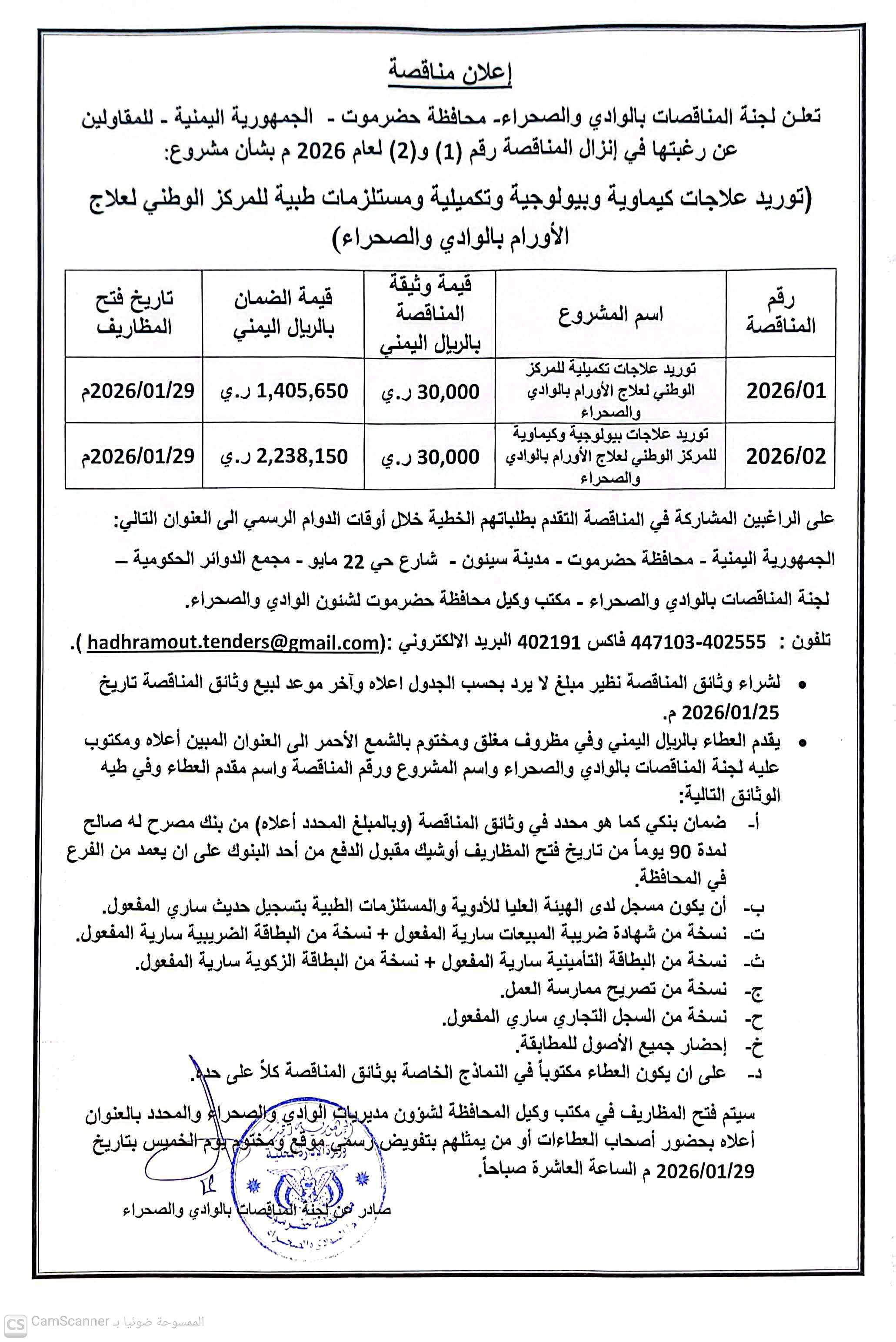 تعلـن لجنة المناقصات بالوادي والصحراء- محافظة حضرموت - الجمهورية اليمنية - للمقاولين عن رغبتها في إنزال المناقصة رقم (1) و(2) لعام 2026 م بشأن مشروع: