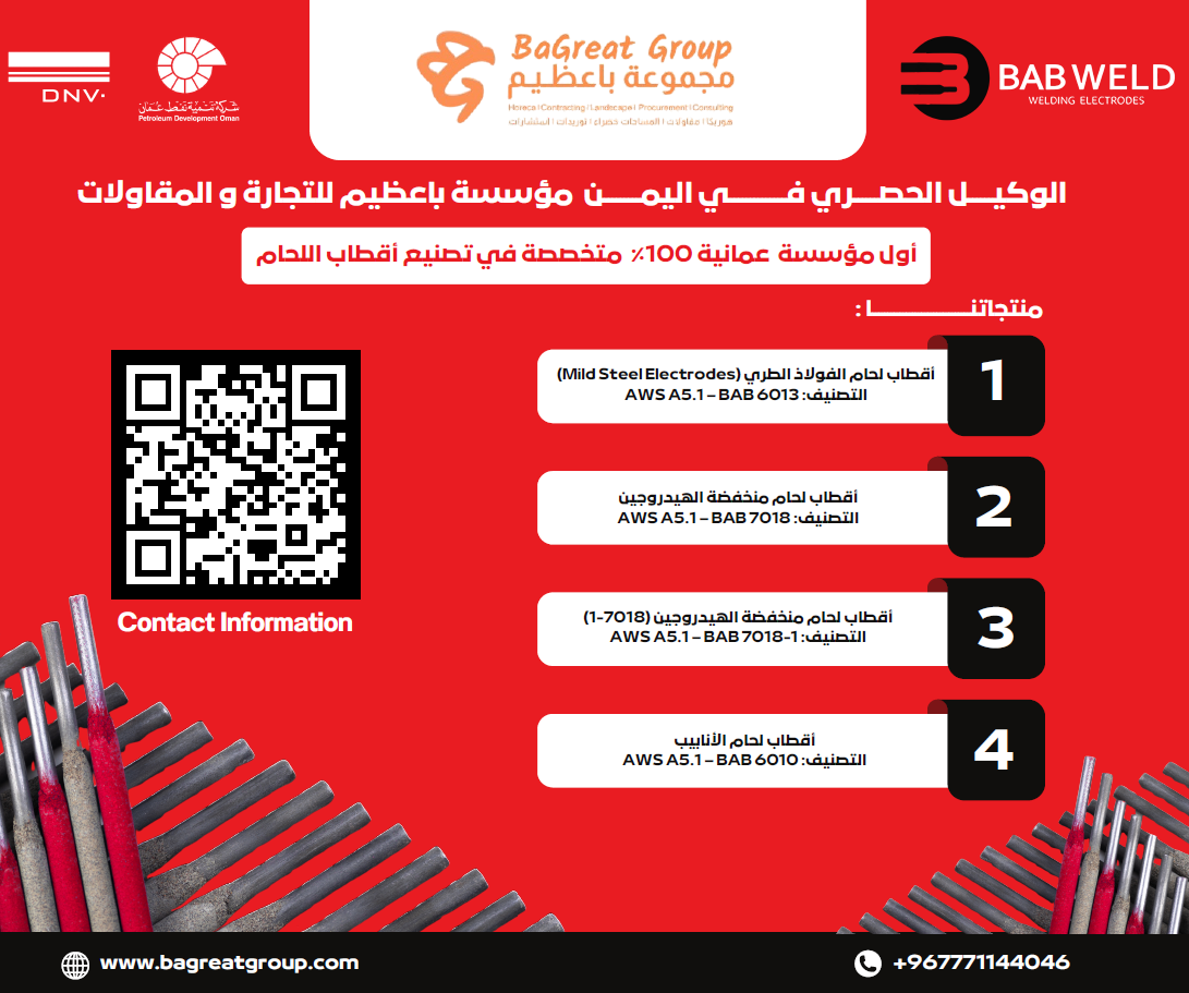 - أقطاب لحام الفولاذ الطري (Mild Steel Electrodes) AWS A5.1 – BAB التصنيف: 6013<br /> - أقطاب لحام منخفضة الهيدروجين AWS A5.1 – BAB التصنيف: 7018<br /> - أقطاب لحام منخفضة الهيدروجين (1-7018) AWS A5.1 – BAB - التصنيف: 1-7018<br /> - أقطاب لحام الأنابيب AWS A5.1 – BAB التصنيف: 6010<br /> <br /> أقطاب E6013 (فولاذ كربوني):<br /> النوع: طلاء كثيف منخفض الهيدروجين مع بودرة الحديد<br /> الخصائص: جودة راسب قابلة للفحص بالأشعة، كفاءة ترسيب >110%، سهلة الاستخدام في كافة الوضعيات وسهلة إزالة السداد<br /> الاستخدامات: أعمال اللحام الخفيفة والمتوسطة، معدات مشغّلة ديناميكيًا، مراكب الضغط، الجسور، خطوط الأنابيب والهياكل الثقيلة <br /> الأقطار المتوفرة: 2.5 مم، 3.2 مم، 4 مم.<br /> <br /> <br /> أقطاب ( 7018‐1 فولاذ منخفض الهيدروجين – فولاذ كربوني)<br /> :النوع: بودرة الحديد، كهربود منخفض الهيدروجين، ينتج لحامًا قويًا ومرنًا<br /> الخصائص: جودة قابلة للفحص بالأشعة، أداء ممتاز عند درجات حرارة منخفضة جدًا (حتى –50 °C)، مقاومة الشقّات الناتجة عن الهيدروجين <br /> الاستخدامات المثالية: اللحام على الهياكل الثقيلة، معدات الضغط العالي، منشآت بحرية، منشآت للتكرير، منصات حفر، مرافق تتعرض لصدمات شديدة، هياكل منصات تشغيلية ثخينة من الكربون ستيل <br /> الأقطار المتوفرة: 2.5 مم، 3.2 مم، 4 مم.