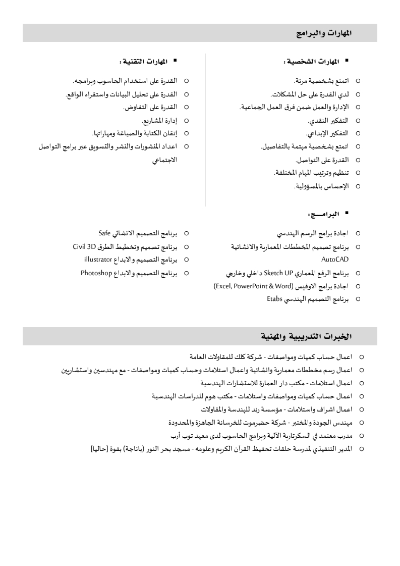 • خبرة في مجالات عدة مثل الاشراف الهندسي وحساب الكميات واعداد الجداول الزمنية واعداد المخططات الانشائية والمعمارية وتنسيق مشاريع وضبط الجودة في الخرسانات وترميم المنشآت وغيرها بخبرة 5 سنوات